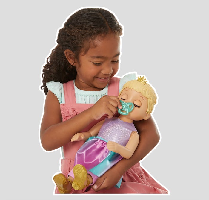 Caring for Princess Ellie as a baby helps her grow. So, each time your child rocks her, pretends to feed her with her bowl and spoon, gives her a pretend drink from her sippy cup, or lets her have her pacifier, it helps Princess Ellie grow.