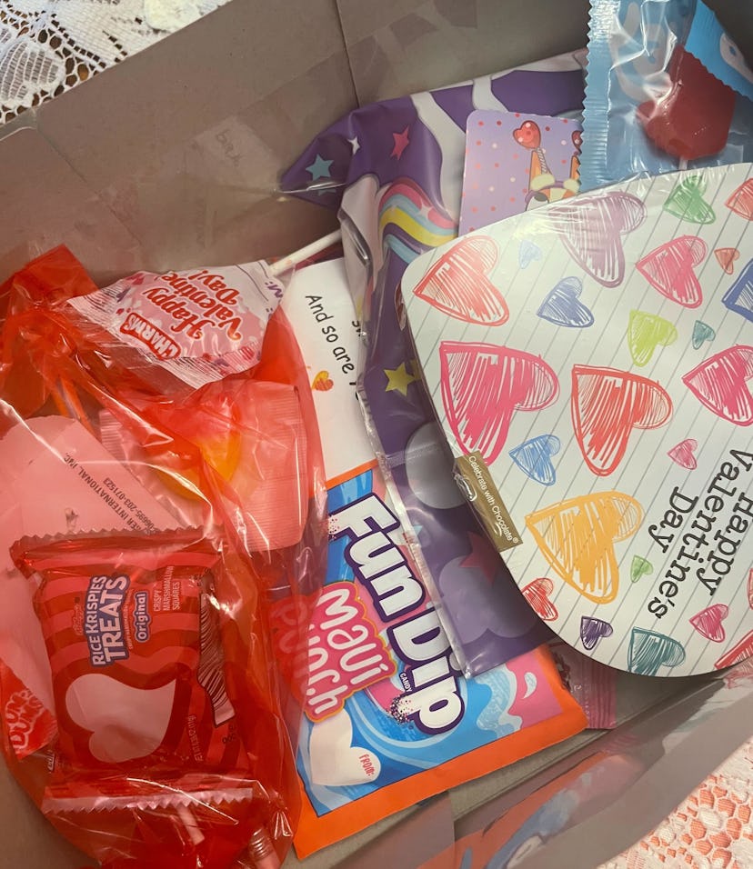 My 5-year-old brought her box in and went through every piece with pure, exquisite joy. “Oh! This one is from Hailey!” she shouted. “Oh! I love gummy worms and Henry got me some!” She opened goody bags and was just as thrilled with the pencils and the tiny puzzles and the impossibly small dinosaurs as she was with the bag of frosted animal cookies. They were gifts from her friends! It was a whole big day at school! She wants to come home and share it with me!