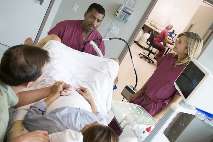 In my head, I always imagined that the first time I saw my baby-to-be, my partner and I would excitedly embrace and maybe cry as we gazed at the image of the ultrasound tech captured with a nice, totally not gooey wand placed on my cute, ever-so-pregnant belly. Like the couples in literally every TV show and movie I'd ever watched, I expected to have a non-invasive exam whereupon I'd get to see an actual baby, pretty much immediately after getting a positive pregnancy test. Lies, lies, and more lies.
