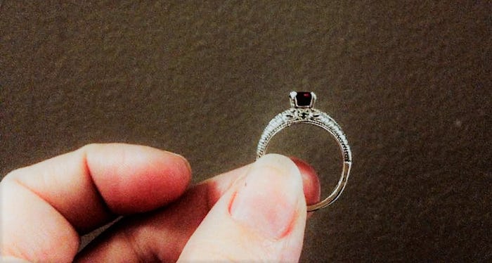 We were in our kitchen at home on a stormy October night. He got out the box and said he hadn't properly asked me yet. I said with a grin, "Ask me what?" He then asked me to be with him for our 'forevers.' And the surprise wedding band? A Damascus steel hand-crafted wedding band. We're both chefs, so this was very meaningful to us. I began wearing the ring immediately, because why not? Everything else we'd done in our relationship had been atypical, this might as well be, too."