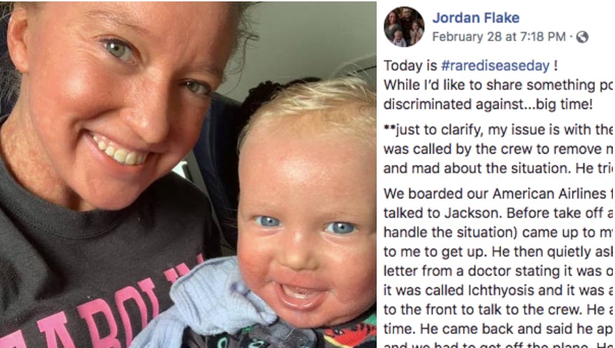 After a mom posted about her experience on a recent flight with her son, both of whom have a rare skin condition, American Airlines has issued an apology to her and addressed the incident. Jordan Flake first shared her story on Facebook on Feb. 28, claiming that she and her son, Jackson, were "discriminated against" and kicked off the flight after an airline employee allegedly asked about her “rash” right before take-off.