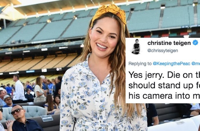 "Yes jerry. Die on this hill," Teigen replied. "This is what you should stand up for. A man’s right to shoot his camera into my (tinted) car. This is a great cause."
