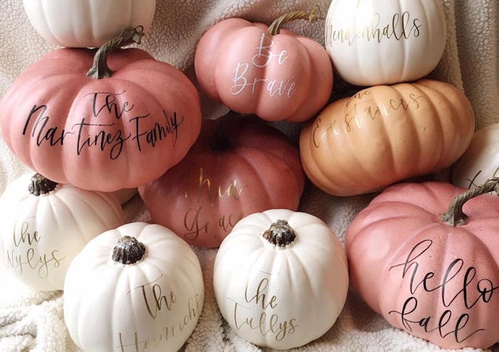 Or you could go for these personalized pumpkins, which you can get made with your last name or whatever welcoming phrase you want. The soft colors are a step up from traditional orange, and they're made of foam so they won't rot before Halloween even arrives. (And you can reuse them every year.)