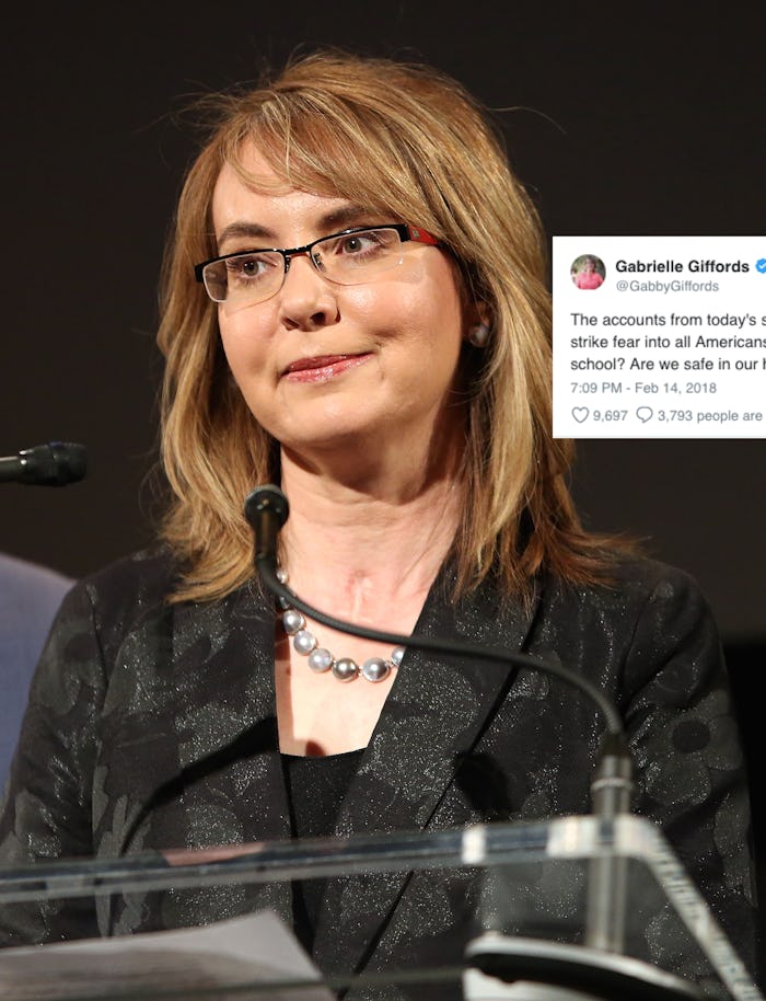 Giffords, who was shot in the head in an assassination attempt while representing Arizona's 8th District in 2011, has continued her role as an outspoken gun safety advocate since her resignation from Congress. "Even in our grief, we must summon the courage to fight against this fear," she tweeted. "Our leaders must find the courage to escape the confines of their politics & pursue the moral necessity of peace & safety.