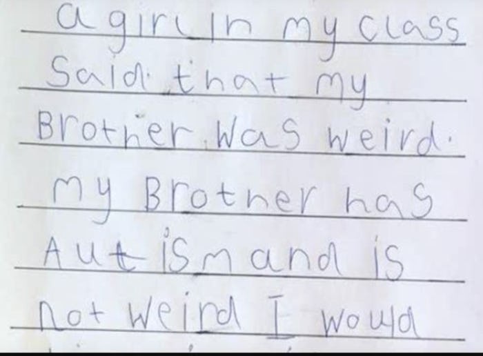 "On Monday I felt very sad because a girl in my class said my brother was weird," she wrote in the letter her mom, Sophie Camilleri, soon shared on Facebook. "My brother has autism and is not weird. I would like it if we could learn about all disabilities in schools so that everybody understands that some people are different, but we should all be treated the same."