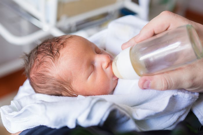 Both of my babies were breastfed, but we all know that not all women can or want to breastfeed. I spoke to labor and delivery nurse Teresa Sivec, RN, to find out when exactly formula fed babies should be given their first "straight out of the uterus" meal. She tells Romper, "It's not an exact science. We generally give them their first bottle within the first hours of birth, sometimes sooner. The thing we really focus on is giving the family time to bond. We encourage skin to skin time, talking to the baby, and we monitor their comfort." She said babies are just as rattled after they're born as the mother is from birthing them, and it's calming just to be on their parent's chest. Many parents choose to feed them during or after this bonding period. "Once that little guy gets tucked up nice and snug against Mommy or Daddy, they tend to take the bottle better, as they're more comfortable in their surroundings."