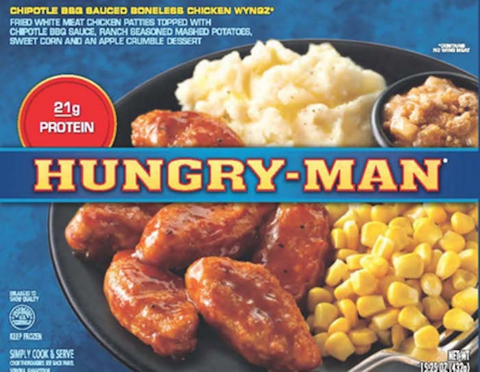 Certain 15.25-ounce Hungry-Man microwaveable dinners are now included in this recall stemming from potentially-contaminated whey powder, as Delish reported. Hungry-Man dinners that are affected include "Chipotle BBQ Sauced Boneless Chicken Wyngz" with a "best buy" date of 9/16/19, according to the U.S. Department of Agriculture's (USDA) Food Safety and Inspection Service (FSIS). Pinnacle Foods, Inc., which produces the frozen dinners, and Hungry-Man voluntarily recalled them after being notified by their supplier that a whey powder ingredient used in the ranch dressing seasoning had been recalled for potential salmonella contamination, according to Delish. (In case you were wondering, the seasoning was added to the mashed potatoes that was packaged with the chicken dinner.)