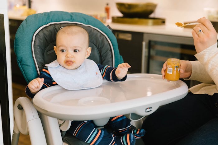 Dr. Gina Posner, a pediatrician at MemorialCare Orange Coast Medical Center in Fountain Valley, California, agrees, adding that part of the reason for the wait time is that babies still have a tongue thrust reflex which causes them to push the food out of their mouth. "They can also aspirate on the food," Posner tells Romper in an email interview. "Introducing too early can also lead to an increased risk of obesity. It can also upset their belly since it is not ready for food yet."