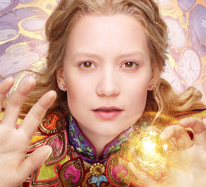 In a movie full of technicolor backdrops, CGI costars, and bulbous heads stretched to unnatural proportions, the most striking look is the one actor who actually looks like a human being. But is Mia Wasikowska makeup-free in Alice Through The Looking Glass? Not quite. She just seems that way when compared to her overpainted costars. Look closely and you'll see some blush, a dab of lip color, and some concealer and/or foundation. In an age of high-definition TV, where even actors playing a character with the flu still sport false eyelashes, a minimalist look stands out. Urban Decay even has a new palette inspired by the film.