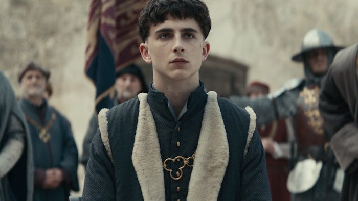Timothée Chalamet traded his hand-rolled cigarettes for a bowl cut, and honestly, I'm not even mad. On Aug. 27, Netflix dropped the trailer for The King, and fans are already fawning over the Call Me by Your Name actor's new leading role as King Henry V of England. The preview for Netflix's latest movie sets up enough betrayal and schemes to align itself with works by William Shakespeare, leaving viewers curious about the origins of the royal epic. So is The King based on Shakespeare? There's a reason why the period piece feels so familiar.