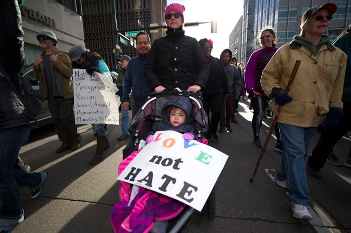 On Saturday, January 21, just 24 hours following President Trump's official inauguration to the presidency, thousands and thousands of activists took the streets of Washington, Portland, New York, San Diego, and other cities all over the country to lead marches in protest of his election, his hateful rhetoric, and his treatment of immigrants, women, and those in marginalized communities. Though the day brought endless messages of hope, passion, inspiration, and conviction in the fight for the rights of those who feel ignored and at-risk in a Trump White House, the most empowering signs from little feminists marching all over the country helped highlight not only what's at stake in the next four years, but also how bright (and powerful) the future is going to be.