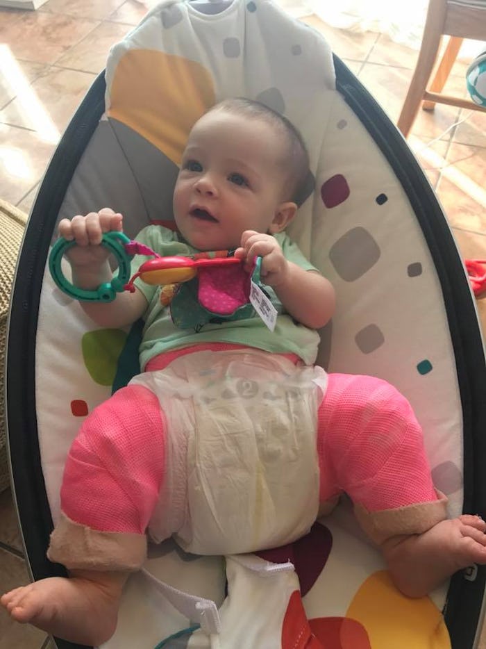 After three long months, it was time to remove the cast — but Abigail’s treatment wasn’t over yet. She moved onto wearing a hip abduction brace, which positioned her hips to allow the socket to continue to round over the bone. The brace allowed for her to move more freely than the cast did, but our doctor didn't give us a clear timeline on how long she’d have to wear it. It all depended on how fast or slow her hips grew.