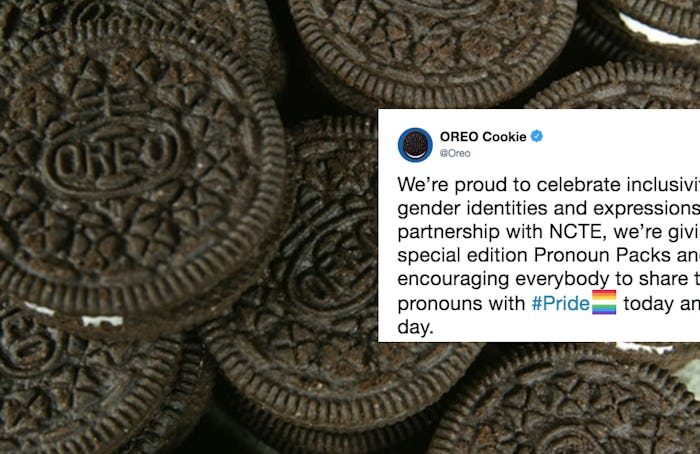 Every year when June rolls around, companies make it a point to support the LGBTQ+ community by selling rainbow merchandise. That's because June is unofficially Pride Month — a time to acknowledge and celebrate the spectrum of sexual and gender identities. Oftentimes, this merch gives back to organizations that actively contribute to these communities. But even when it doesn't, it's always nice when one of your favorite brands stands for love and equality. Well, one beloved brand just kicked things up a notch. Because Oreo's special edition Pronoun Packs celebrate ALL gender identities.