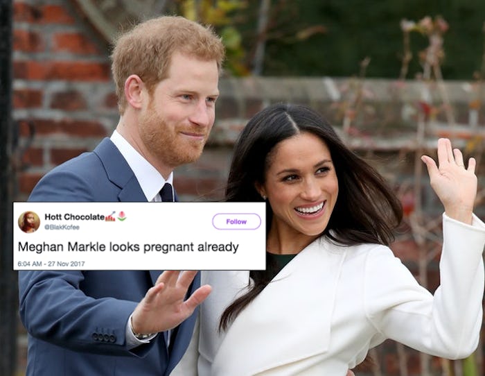 Royal family fans had a collective flip-out on Monday morning, when news broke that Prince Harry and Meghan Markle have announced their engagement. But it seems to be one of the official rules of the internet that nothing nice and pure can stay nice and pure for long, so of course people had to immediately start speculating that Meghan Markle had a "baby bump." The source of the rumors? The accomplished actress, humanitarian, and royal-to-be wore a slightly larger coat for her photo op with the press...