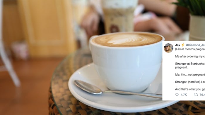 On Friday, a woman revealed on Twitter that she popped into Starbucks for a little pick-me-up, an outing that was interrupted after she was approached by a stranger who was concerned about her coffee intake. The woman noted that while she is, in fact, six months pregnant, she lied to put the mom-shamer in her place. Per the tweet, the stranger — apparently a pseudo pregnancy expert — warned her that she "should be drinking decaf" while pregnant, to which the Twitter user responded by saying, "I'm... not pregnant." While I don't usually condone lying, in this case it was warranted.