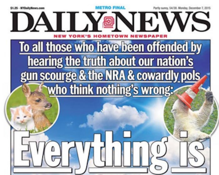 If you’ve been keeping your eye on The Daily News, it is clear that they are the main outlet spearheading this charged campaign. While the puppies and cats covering today’s issue is daring on its own, they have ruffled quite a few feathers in the days following the San Bernardino shooting, which claimed 14 lives. Thursday’s “God Isn’t Fixing This” cover prompted lots of debate about whether it was the right approach to take. A ton of publications responded that mocking prayer wouldn't help gun violence, either.