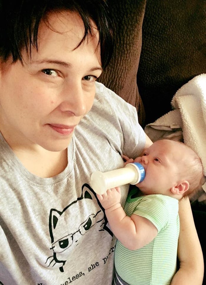 So, rather than force her to take a bottle, I used a supplemental nursing system — basically a bottle with a tube. I would hold the tube next to my nipple, put both in her mouth, and she was able to drink some formula while breastfeeding. Yes, that sounds about as fun as it sounds. The entire feeding process was complicated, messy, and time-consuming. Wasn't bottle-feeding supposed to be easy?