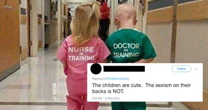Medical Shots, a twitter account with 213k followers that posts health-related content, posted the pic today. In the photo, one child is dressed in pink with 'future nurse' on her back and the other child is wearing green with the words 'future doctor' on his back.