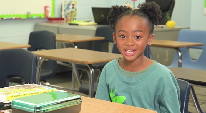 In the video, which PETA (People for the Ethical Treatment of Animals) exclusively shared early with Romper, the young actress sits in a classroom wearing a "Cut class, not frogs!" sweater. Faithe, who plays Annie Pearson on This Is Us, tells viewers that she just learned about the truth behind classroom dissection, which is "definitely not cool. It's actually really gross, and mean."