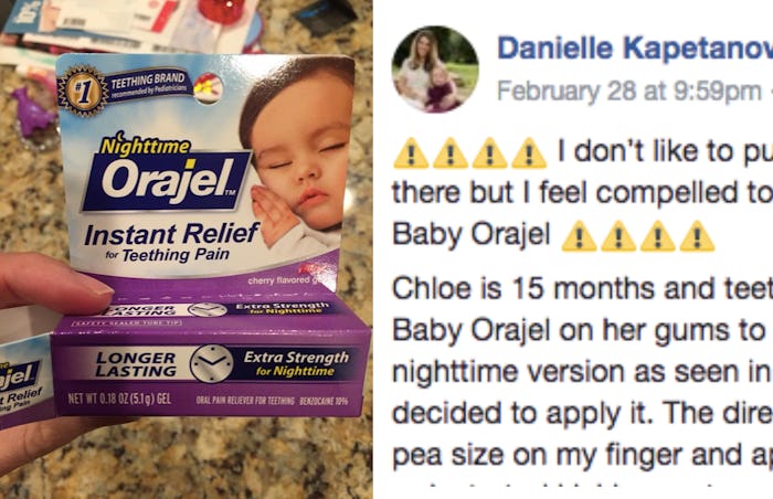 Seeing your child in pain can be one of the hardest things to go through as a parent. The teething period is painful for both parents and children, leading caregivers to try just about anything to provide relief. But this mom is warning parents after her child had a terrible reaction to Baby Orajel. While it is often used by parents without negative consequences, certain components of the product can be dangerous, according to the FDA. Romper has reached out to Orajel for comment, but has yet to hear back at this time.