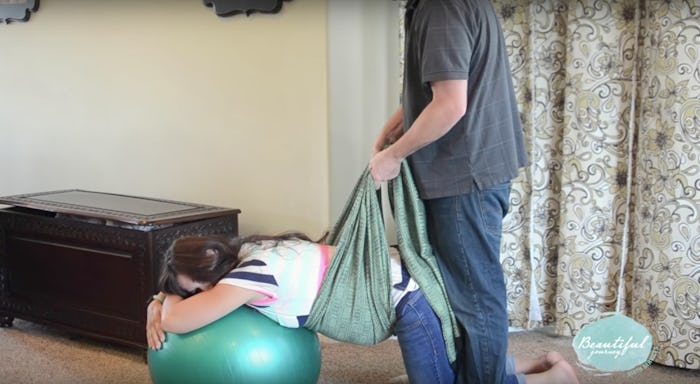 I got on my knees and leaned over a giant exercise ball while my husband stood behind me, opening a large, thin scarf that we found in our closet. (We used a scarf, but something like a large, long pashmina shawl could probably work just as well.)