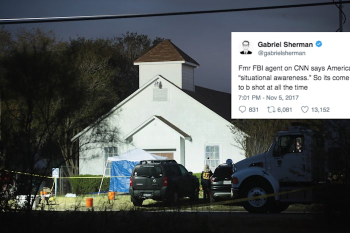 In a tweet Sunday, writer Gabriel Sherman noted that, in an interview with CNN regarding the shooting, a former FBI agent reportedly told the outlet that "Americans need to have 'situational awareness'" to protect themselves during mass shootings. On the surface, that might seem like it could be valuable advice, and it's a concept that often gets discussed in the wake of a massacre. After the Las Vegas shooting in October, Chicago's WGN9 news shared tips from personal safety consultant Doug Cummings about ways to up your chances of survival during an active shooter situation, for example, and situational awareness — that is, paying close attention to what is happening around you at all times — was one of them. As Cummings told WGN9, "One of the key things about being aware is that it gives you a couple of minutes of extra time, sometimes to be able to flee or take some kind of an action."