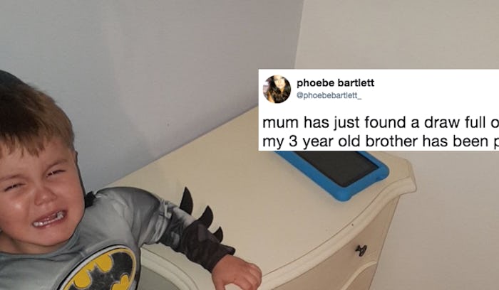 On Tuesday, 21-year-old Phoebe Bartlett shared a picture on Twitter of her little brother, Freddie, crying after his now-infamous "p*ss drawer" was discovered by their mother. In the photo, Freddie's urine-stained drawer is open, and Freddie is sitting on the bed next to it in a Batman costume, crying. (It kind of sums up parenting toddlers perfectly.)