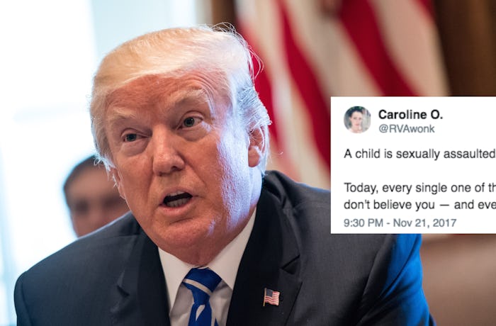 On Tuesday, President Donald Trump threw his support behind Republican Alabama Senate candidate Roy Moore, suggesting the politician and alleged child sex predator will be tougher on crime than his Democratic opponent. Trump's endorsement is not only controversial for his choice of candidate, but also because of the comments he made in regard to the allegations of child sexual assault levied against Moore. And there's one tweet about child sexual abuse that shows the damage Trump is doing to kids everywhere.