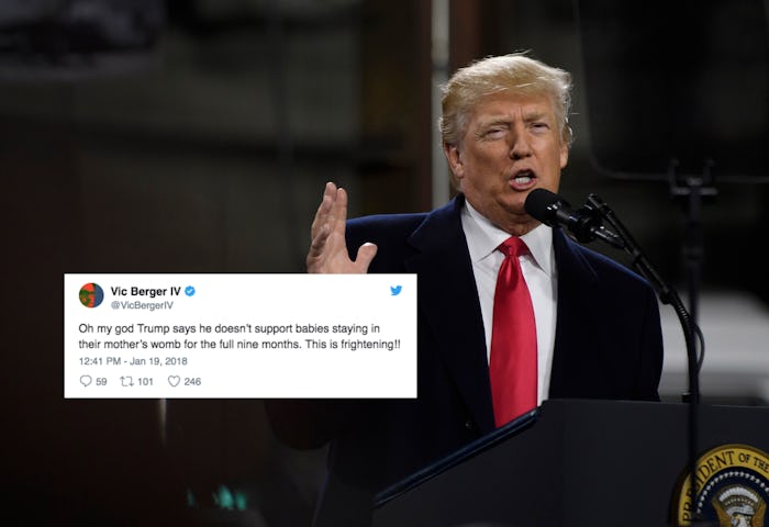Frankly, everyone on social media was really, really confused by Trump's comments at the March for Life. I mean, this wasn't an offhand comment to a staffer, or something overheard by a journalist who snapped up the scoop for a story. Trump was on camera, and said it's "wrong" for a baby to be born in a woman's ninth month of pregnancy. What's hilarious about the comment, though, is that the language is actually more accurate than what he perhaps meant to say: if a baby is delivered in the ninth month, or a few weeks early, that is called birth or delivery — not abortion. Because abortions in the ninth month just don't happen.