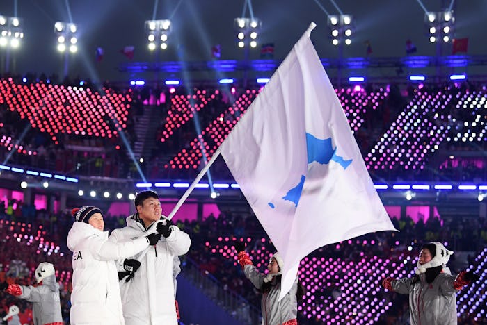 Korea has been divided since 1945, Smithsonian reported. So no matter how the citizens of either country feel about actually unifying as one nation one day, it's definitely notable that the two countries can work together for the Winter Games. The South Korean President, Moon Jae-in, and his wife even shook hands with North Korean leader Kim Jong Un’s younger sister, Kim Yo Jong, as they waited for the opening ceremony to start, TIME reported. A visit to the South by a member of the Kim family is considered "unprecedented," according to the outlet.