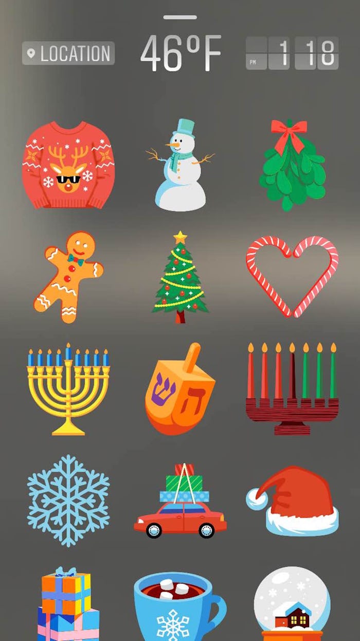 From the looks of it, the stickers range from sharing the current time, temperature, or your location (perhaps similar to Snapchat's geofilter feature), to holiday sweaters, gingerbread man cookies, and candy canes. But there are also stickers that resemble the emojis that many Instagram users like myself have become all too familiar with. You know, the smiley faces (side-eye face is my personal favorite), the various fruit and other food emojis, and a selection of flags from around the world.