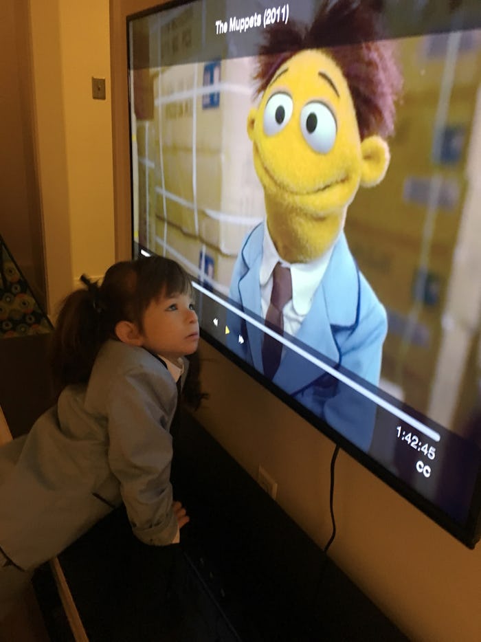 Nicole asked, “Don’t what? Don’t watch The Muppets with other kids?” Esmé nodded. Watching The Muppets is their activity, together. And doing so is not a passive experience for Esmé. We sing along, we laugh, we talk about the characters, especially her friend, Walter. It is a way to be close with her… and an essential topic of conversation when the screen isn’t present or on.