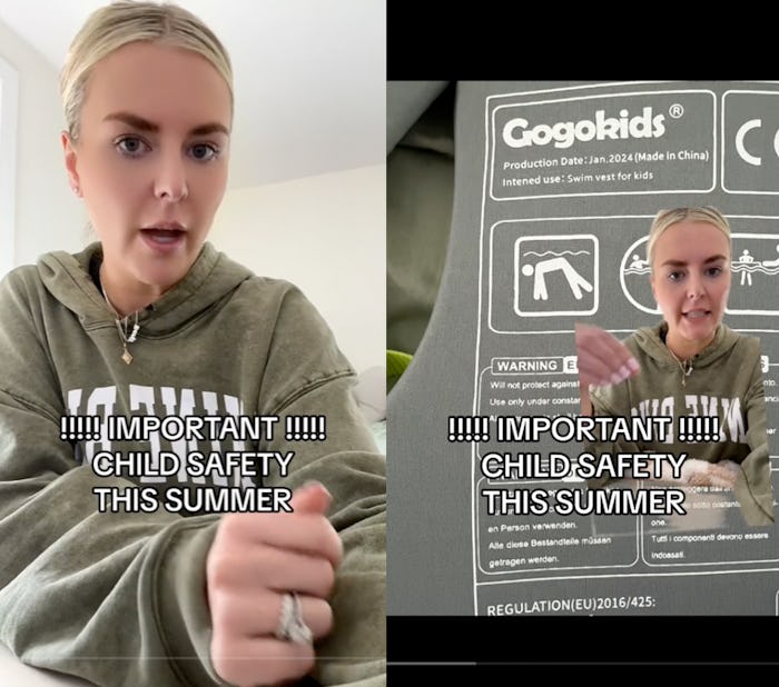 In her video, Wojciak says with summer coming in hot, she wanted to get a life jacket for her son. She opened Amazon, searched “toddler life jacket,” and ultimately purchased one with lots of good reviews. Her father-in-law happened to be at her house when the life jacket arrived. He took a look at the life vest and told Wojciak she shouldn’t use it. When she took a closer look, she saw why: the inside of the life jacket includes a warning label that says the jacket “will not protect against drowning.” It is only intended to be used as a swim vest. She returned the jacket and instead purchased one that is U.S. Coast Guard-approved, she says. Wojciak did the right thing, according to water safety experts, who recommend children only be put in life jackets that are approved by the Coast Guard, as Romper previously reported.