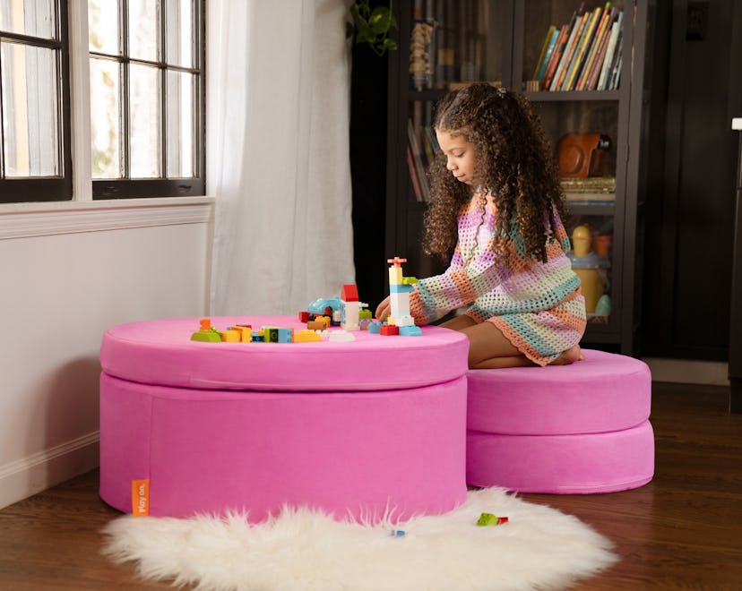 The Chunk is made up of four pieces: one outer circle cushion with an open center, two smaller circles that nestle within it, and one large circle cushion that sits like a lid atop the other three. Currently it comes in 10 colorways to match any decor or the Nugget couch you already have. It measures 32 inches across and 15 inches tall, so compared to the Nugget couch (which is 66 inches long), it’s a more compact play furniture option. And like its couch cousin, you can build so many things with the Chunk, from tables to chairs to hopscotch courses and beyond.